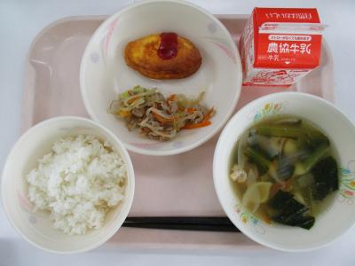 ~ごはん、オムレツ、肉野菜炒め、野菜とマカロニのスープ、牛乳~
