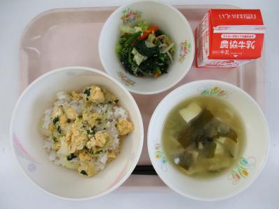 ~(麦飯)、親子丼、ほうれん草のごま和え、豆腐のみそ汁、牛乳~