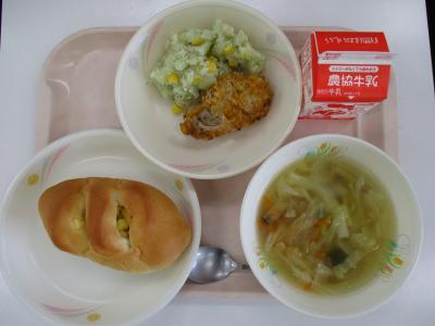 ~チーズクッペ、鶏肉のコーンフレーク焼き、マッシュポテト、野菜スープ、牛乳~