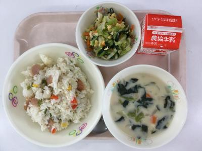 ~ピラフ、青菜とたまごの酢の物、シーフードチャウダー、牛乳~