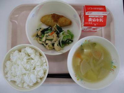 ~ごはん、白身魚フライ、油揚げと小松菜の和え物、めった汁、牛乳~