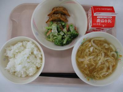 ~ごはん(減)、揚げギョウザ、ブロッコリーのごまマヨ和え、たまごあんかけうどん、牛乳~