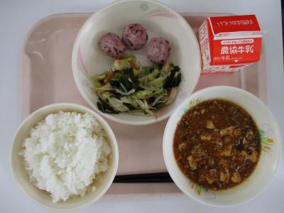 ~ごはん、いかボール、野菜と海藻のナムル、マーボー豆腐、牛乳~