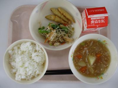 ~ごはん、わかさぎの天ぷら、油揚げともやしのあえ物、じゃがいものそぼろ煮、牛乳~