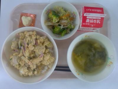 ~(麦飯)、親子丼、野菜のおかか和え、揚げとわかめのみそ汁、牛乳、型抜きチーズ~