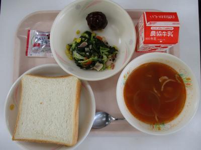 ~食パン、いちごジャム、ミートボール、ほうれん草とコーンのソテー、トマトスープ、牛乳~