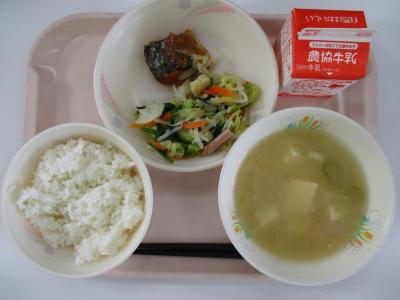 ~ごはん、さばみそ煮、ハムとキャベツの和え物、めった汁、牛乳、青りんごゼリー~