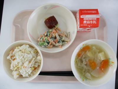 ~たけのこごはん、肉団子、ふきのごまマヨ和え、豚汁、牛乳~
