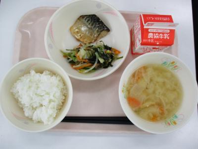 ~ごはん、さばのみりん焼き、海藻と野菜のサラダ、打ち豆汁、牛乳~