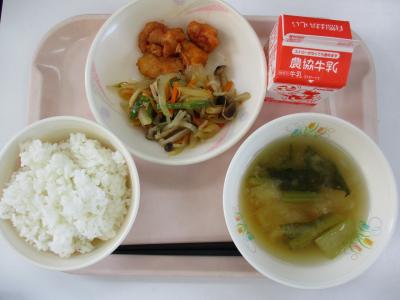 ~ごはん、ひとくち白身魚の甘酢あん、野菜炒め、みそ汁、牛乳~