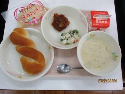 ~米粉パン、デミグラスハンバーグ、ポテトサラダ、コーンポタージュ、牛乳、お祝いクレープ~