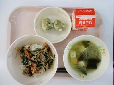 ~(麦飯)、ビビンバ丼、しゅうまい、大根とわかめのみそ汁、牛乳~