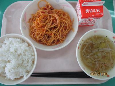 ~ごはん(減)、スパゲッティミートソース、野菜スープ、牛乳~