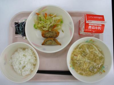 ~ごはん、ひじきのり、揚げギョウザ、キャベツのごま和え、たまごあんかけうどん、牛乳~