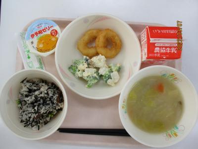 ~カルシウムたっぷりひじきごはん、イカリング、記憶力アップサラダ、白玉汁、牛乳、い~よかんゼリー~