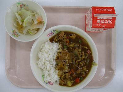 ~(麦飯)、カレーライス、福神漬け和え、牛乳~