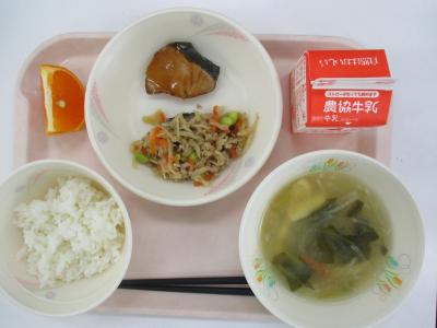 ~ごはん、ぶりの照り焼き、切干大根のそぼろ炒め、油揚げのみそ汁、牛乳、せとか~