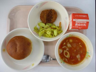 ~胚芽バンズ、メンチカツ、野菜のカレー炒め、ポークビーンズ、牛乳~