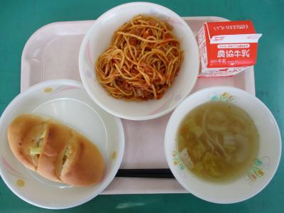 ~チーズクッペ、スパゲッティミートソース、野菜スープ、牛乳~