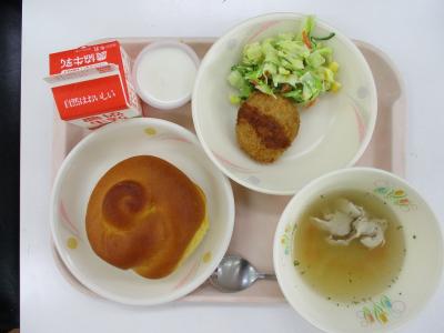 ~キャロットパン、トンカツ、コールスローサラダ、春雨のスープ、牛乳、フルーツミルク寒天、牛乳~
