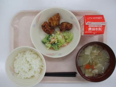 ~ごはん、輪島フグの竜田揚げ、ブロッコリーのごまマヨ和え、具だくさんみそ汁、牛乳~