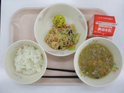 ~ごはん、かぼちゃシューマイ、エビ入りビーフン炒め、厚揚げの中華煮、牛乳~