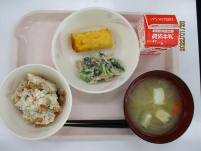 ~海女採りサザエごはん、卵焼き、小松菜のごま和え、輪島めった汁、牛乳~