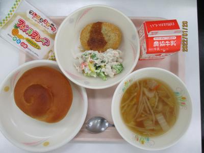 ~ミルクロール、ポークコロッケ、れんこんマヨサラダ、白菜のスープ、牛乳、パインクレープ~