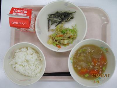 ~ごはん、豆あじ青のりあげ、キャベツのごま和え、じゃがいものそぼろ煮、牛乳~