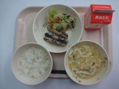 ~ごはん(減)、ちくわの石垣揚げ、ハムとほうれん草の和え物、だまごあんかけうどん、牛乳~