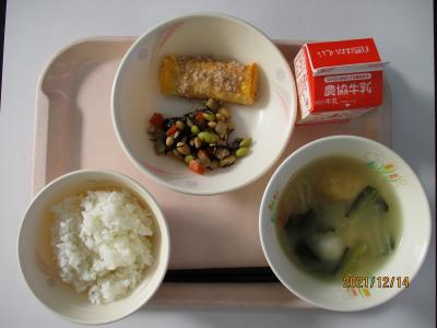 ~ごはん、卵ロールのひき肉あん、五目煮豆、けんちん汁、牛乳、みかん~