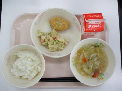 ~ごはん、コーンコロッケ、ツナサラダ、冬野菜のぽかぽか汁、牛乳~