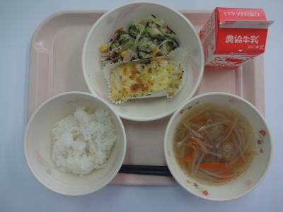 ~ごはん、マカロニグラタン、ひじきのサラダ、肉団子スープ、牛乳~