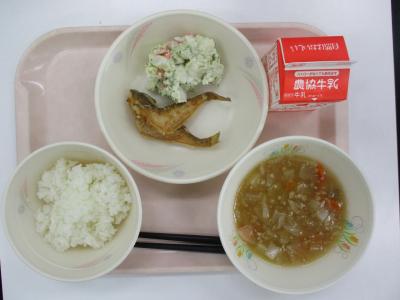 ~ごはん、はたはた唐揚げ、ポテトサラダ、大根のそぼろ煮、牛乳~