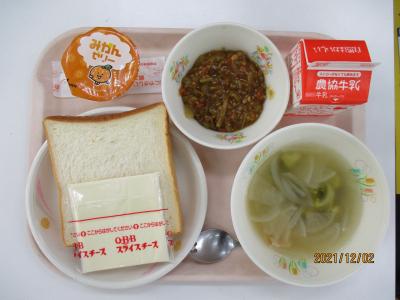 ~ミルク食パン、スライスチーズ、ドライカレー、野菜のコンソメスープ、牛乳、みかんゼリー~