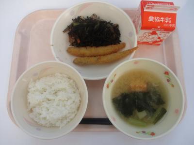 ~ごはん、ししゃもフライ、ひじきの炒め煮、厚揚げのみそ汁、牛乳~
