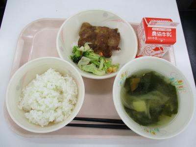 ~ごはん、豚肉のくわ焼き、カラフルサラダ、わかめのみそ汁、牛乳~