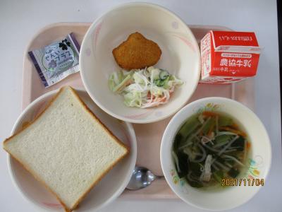 ~ミルク食パン、ジャム、焼き栗コロッケ、春雨サラダ、コンソメスープ、牛乳~