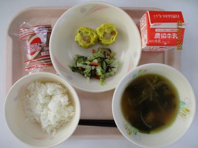 ~ごはん、かぼちゃシュウマイ、ひじきのサラダ、わかめスープ、牛乳、マロンワッフル~