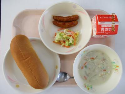 ~コッペパン、ウインナー、キャベツとコーンのサラダ、ミルクスープ、牛乳~
