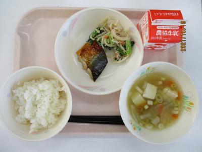 ~ごはん、さばの照り焼き、小松菜のごま和え、根菜のみそ汁、牛乳~