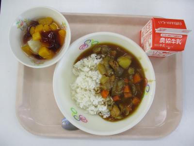 ~麦飯、鶏肉のカレーライス、フルーツのゼリー和え、牛乳~