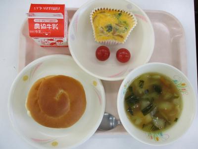 ~ミルクロール、カラフルオムレツ、ミニトマト、春雨と肉団子のスープ、牛乳~