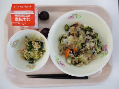 ~麦飯、中華丼の具、ササミと野菜のナムル、巨峰、牛乳~