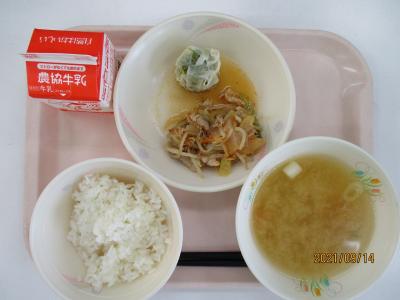 ~ごはん、野菜しゅうまい、豚キムチ炒め、みそ汁、牛乳~