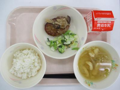 ~ごはん、和風ハンバーグ、大豆のサラダ、みそ汁、牛乳~