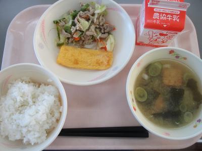 ~ごはん、卵ロール、肉野菜炒め、みそ汁、牛乳~