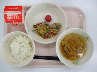 ~ごはん、チンジャオロース、ミニトマト、にゅうめん、牛乳~