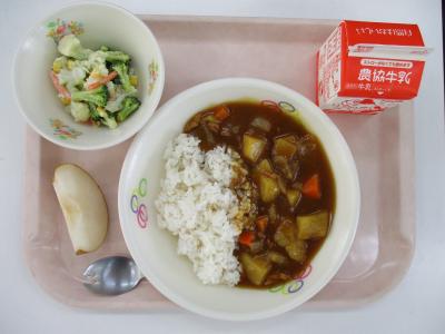 ~麦飯、カレーライス、ブロッコリーサラダ、梨、牛乳~
