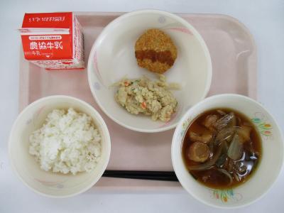 ~ごはん、キャベツメンチカツ、うの花、なめこと麩の赤だし、牛乳~